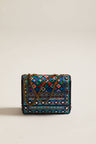 Description: A sling bag, created with geometrics print created on a rich satin fabric. It's print is further highlighted with some mirror and delicate hand work.