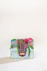 A stunning hand bag created in our abstract floral prints with a turn lock closure and three dimensional embroidered organza flowers. A perfect addition to your collection of your accessories.