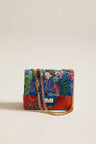 Description: A turnlock chain sling bag, created with a tropical and geometric print on a rich velvet fabric. It's print is further highlighted with some delicate hand work.