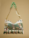 Description: An elegant petit handbag, with beaded tassel bottom. Created in our beautiful satin print fabric, it comes with a convenient zip closure and a stylish resin sling.